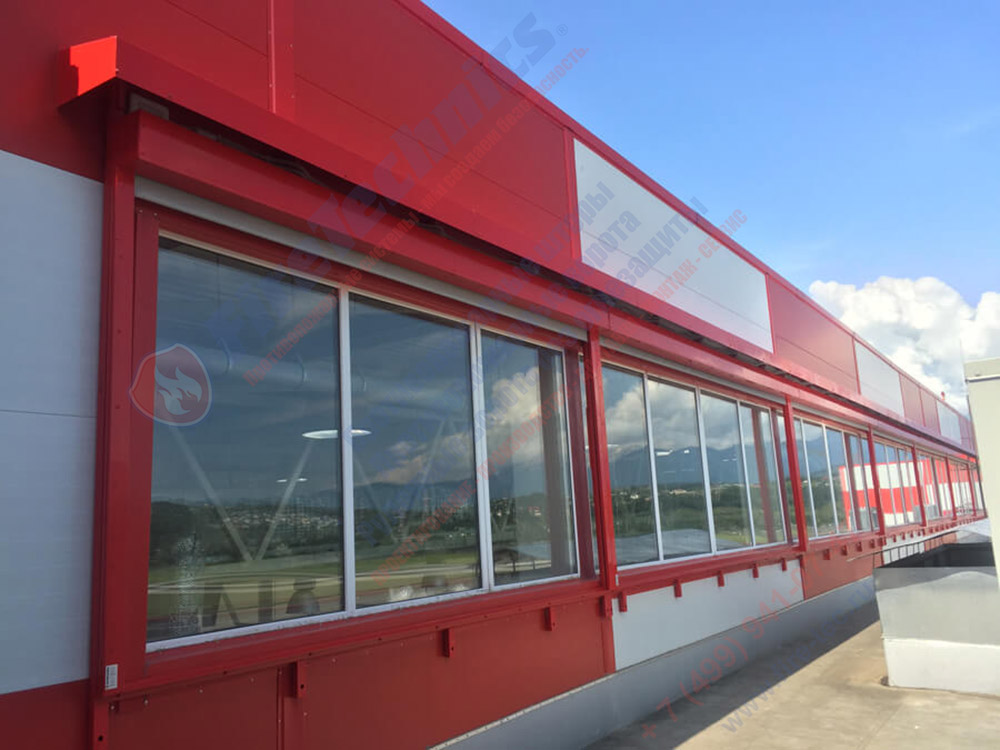 При получении сигнала «Пожар» от пожарной сигнализации активируется система управления, которая приводит в движение механизм опускания защитного экрана. Он полностью перекрывает проём, блокируя дальнейшее распространение огня, дыма, что обеспечивает безопасную эвакуацию людей в установленные законом сроки.